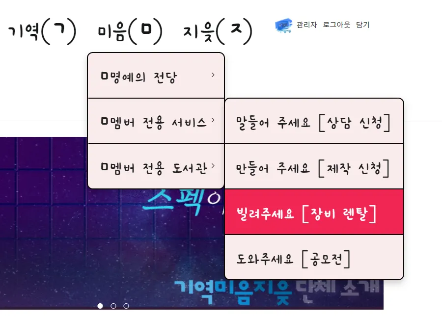 공식 홈페이지 > 미음(ㅁ) > ㅁ멤버 전용 서비스 > 빌려주세요 [장비렌탈]을 클릭합니다.